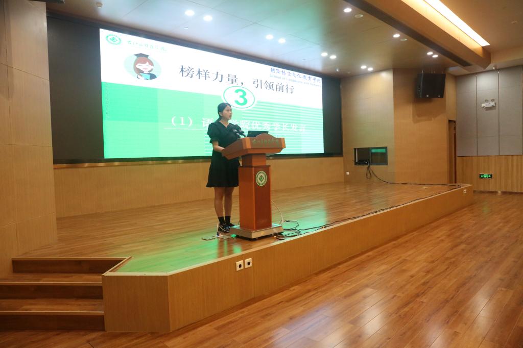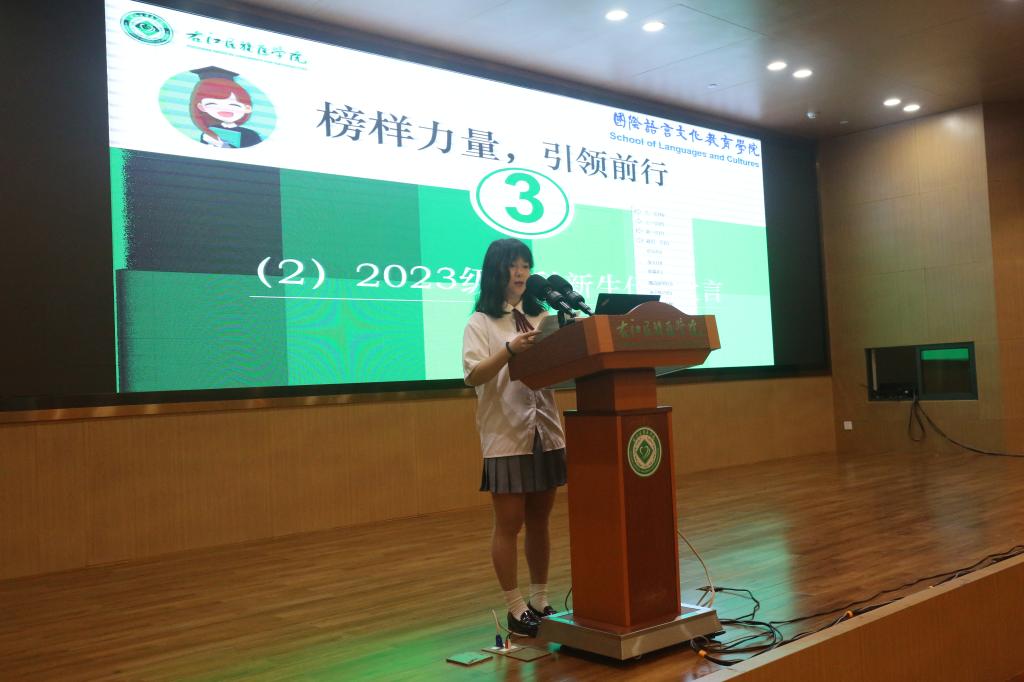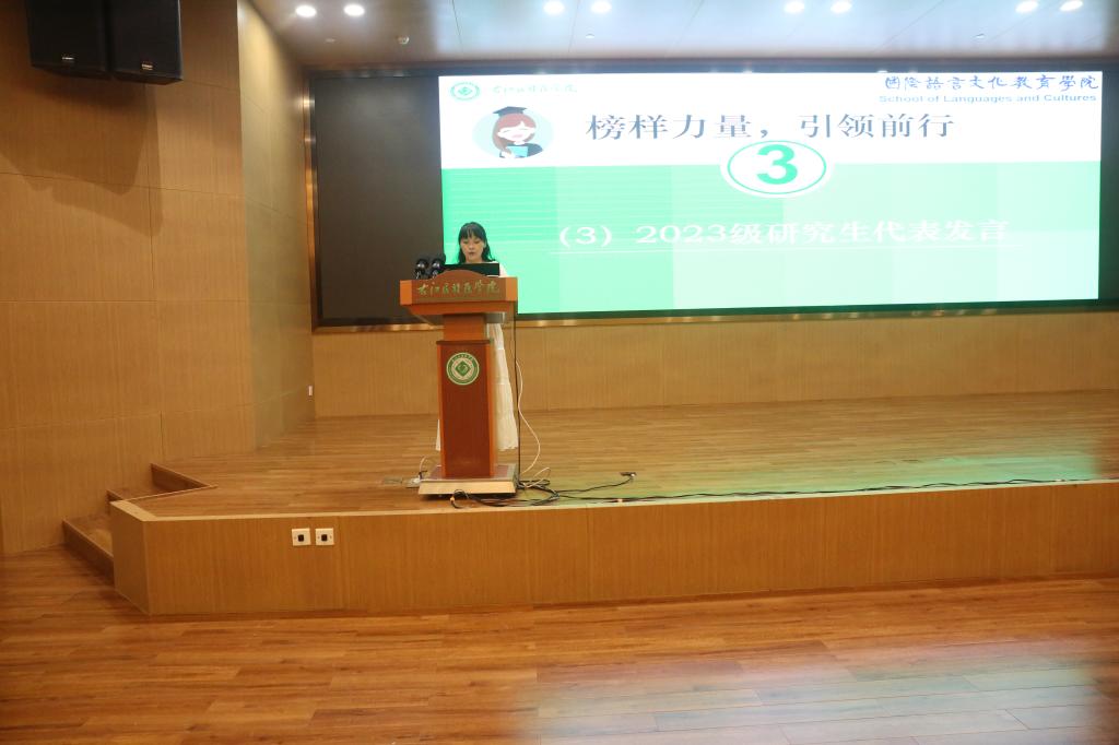 优秀员工代表2020级英语专业钟杏同学分享了她的学习心得体会,她希望学弟学妹们把握大学时光,扎实学好专业知识,提前做好职业规划。2023级翻译专业本科生王艳召同学代表本科新生发言,她表示将尽快适应老员工活,一如既往地积极上进,勤学苦练,争做品学兼优的新青年。2023级翻译硕士研究生代表杨靓同学在发言中谈了她对右医的初印象:背着书包的学子,无私奉献的老师,默默付出的校园工作者……她说走在右医是一种美的享受,若“以物观我”置身其中的我们,也融入了右医美丽的校园画卷中。在求学的道路上,她将以无畏困难之姿勇攀知识高峰,以自律自省之心追逐青春梦想,以不忘初心的真诚去拓展生命宽度。