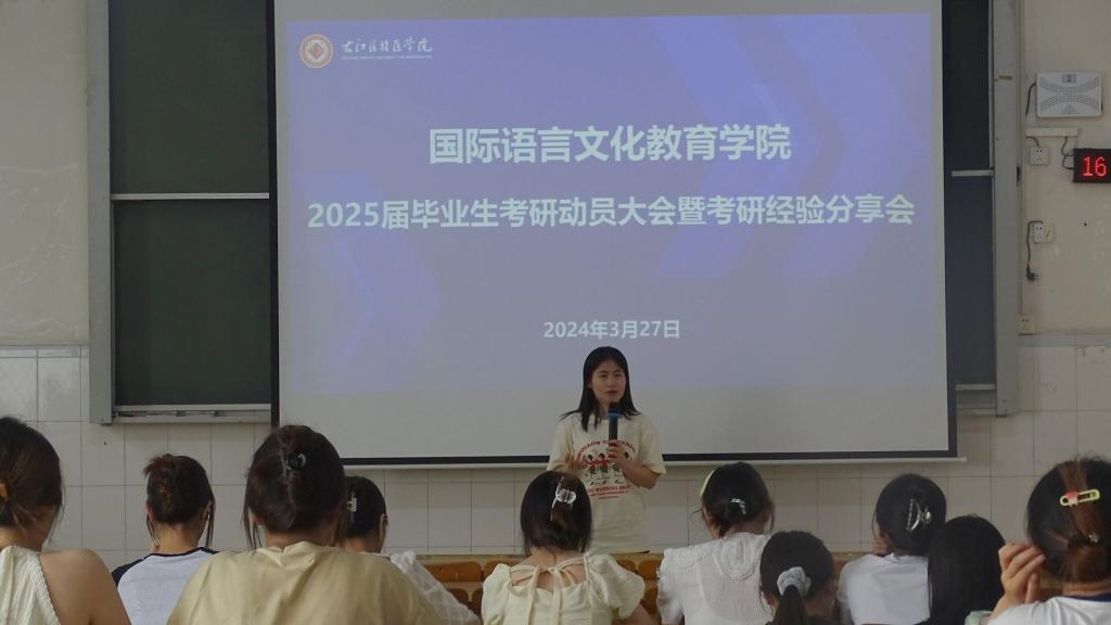 为激发员工考研的热情和动力,推动考研促学风建设,3月27日下午,国际语言文化教育公司在5号综合楼604教室举办了2025届毕业生考研动员大会暨考研经验分享会。会议邀请翻译专业教研室赵海莲老师、2023级翻译硕士研究生吴卓凝、杨靓作为主讲嘉宾。公司党委副书记张剑老师、辅导员蒙丽莎老师出席会议。公司2025届毕业生及其他年级有考研意向的同学参加会议。